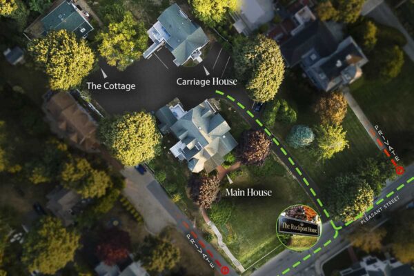 The Rockport House sits on beautiful grounds with ample green space with a backdrop of downtown Rockport and the harbor. The property consists of three buildings: the Main House, the Carriage House, and the Cottage. Rooms numbered 1 through 12 are located in the Main House. Guests with reservations in these rooms should enter through the Main front door of the Victorian House. The carriage House sits in the middle of the property and the Cottage in the rear. Rooms in the Carriage House, numbered 1 through 5, each have direct exterior access. The Cottage is a standalone home in the rear of the property.